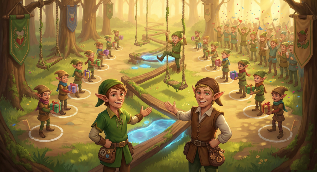 The game was simple: each team had to pass a single gift down a line of 36 elves. If the gift reached the final elf without a dent, that team won. The tricky part was that the line stretched across a 50-meter obstacle course, and each elf could only move within a tiny circle. Only the captains were allowed to run freely along the course, shouting instructions and keeping everyone calm.